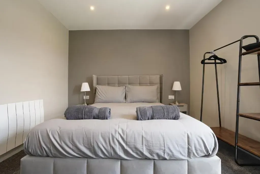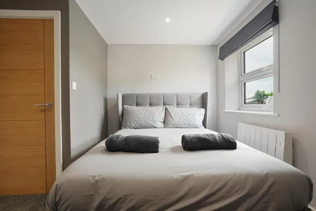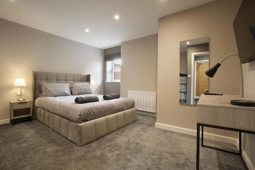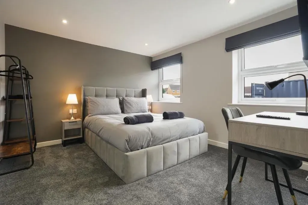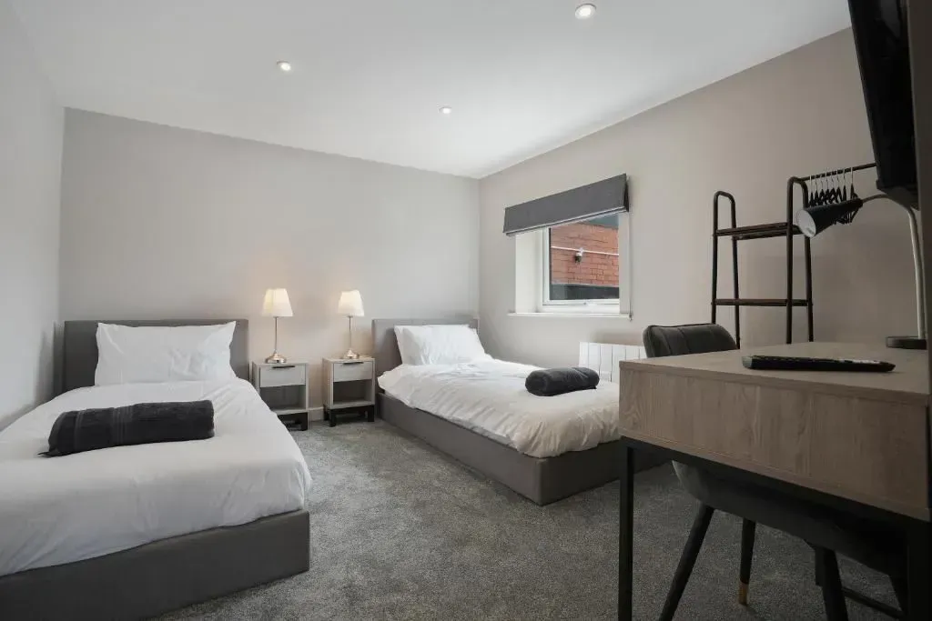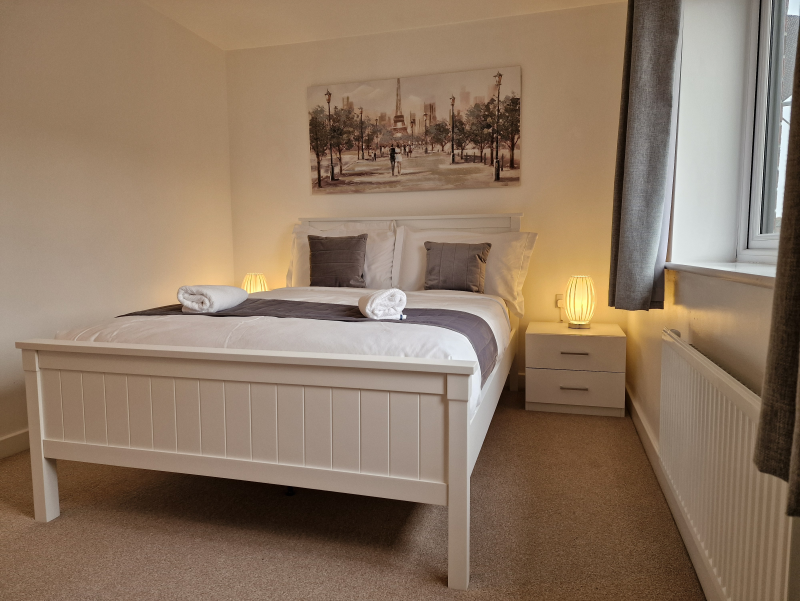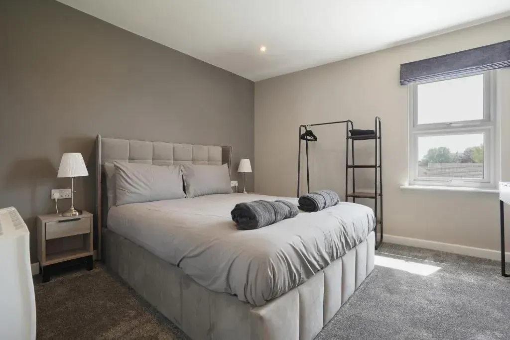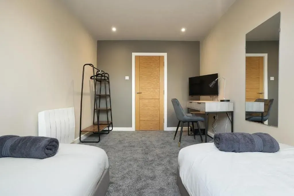 Our 2 Bed Deluxe apartment is on the ground floor at the rear of the building. 2 full bedrooms with desks and access to our gated carpark, secure for your vehicle.