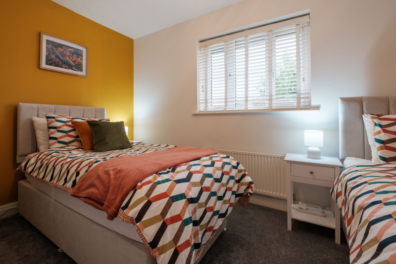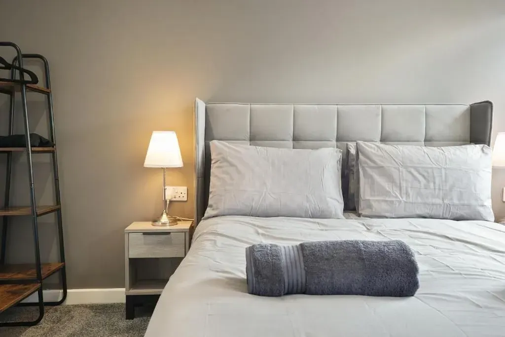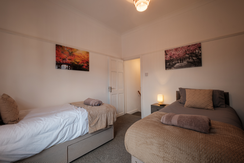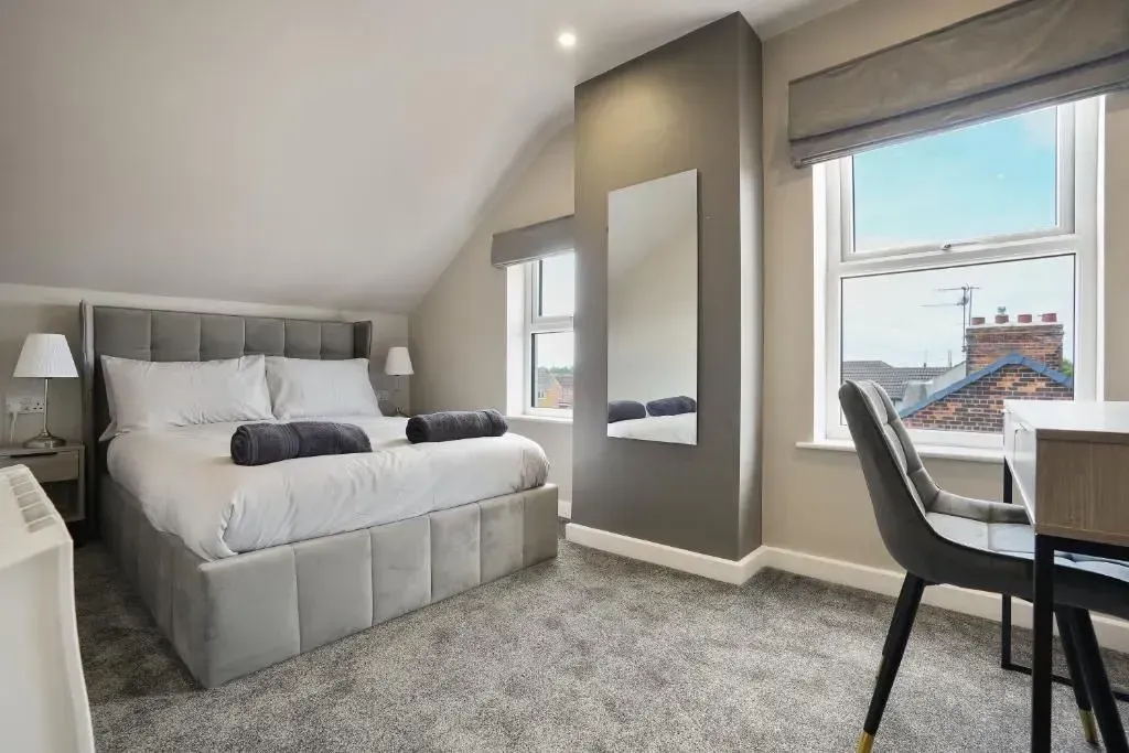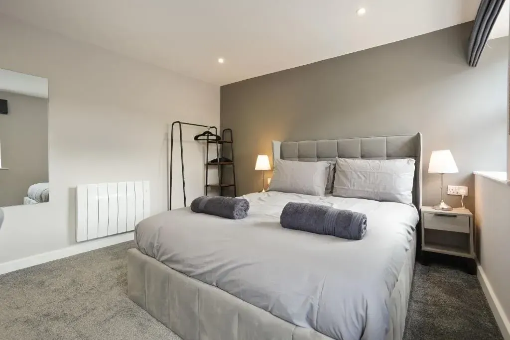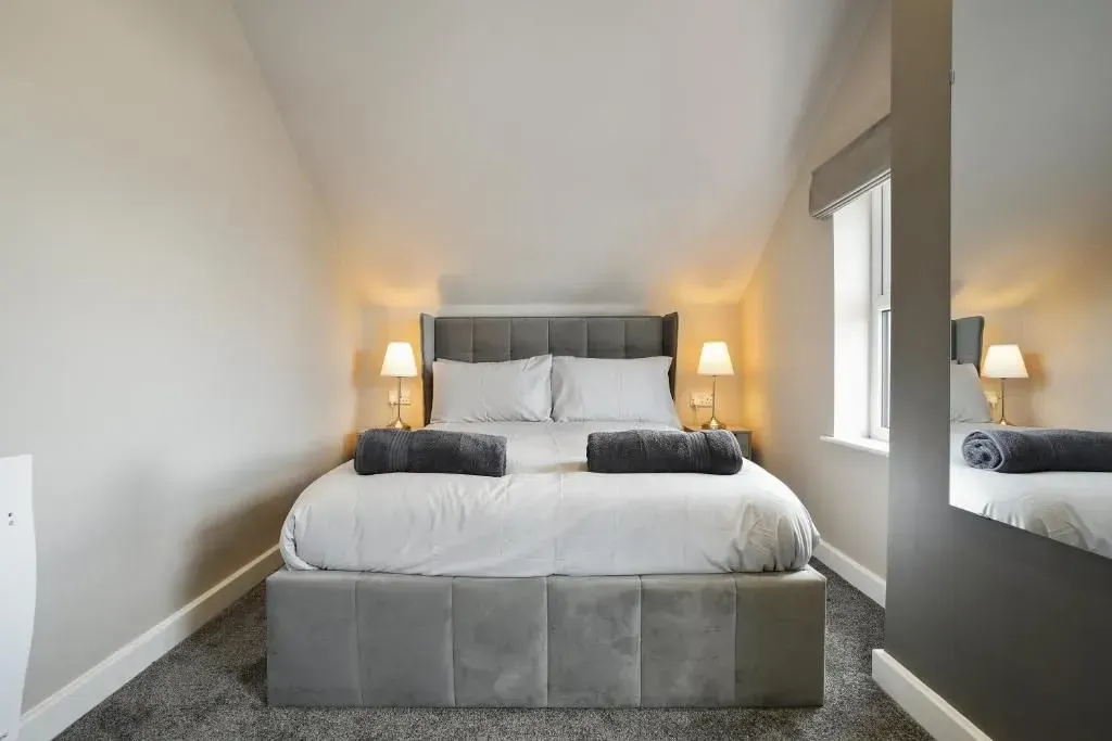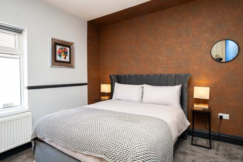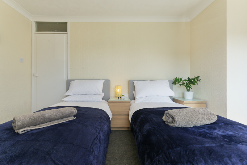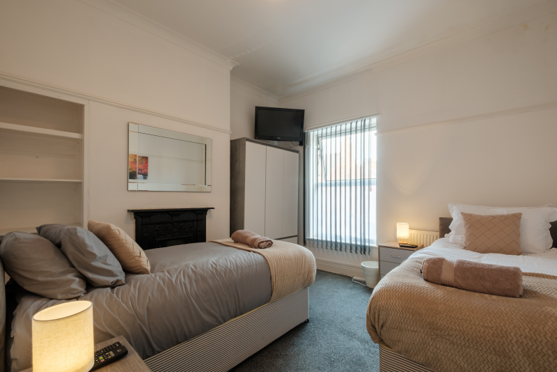 Our 2 Bed Deluxe apartment is on the ground floor at the rear of the building. 2 full bedrooms with desks and access to our gated carpark, secure for your vehicle.