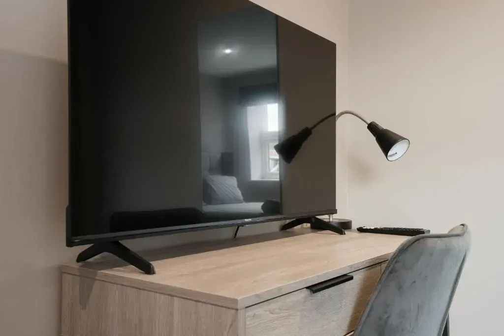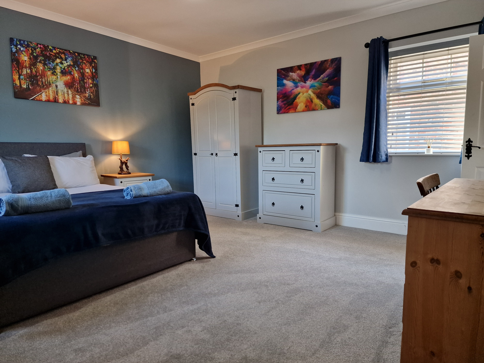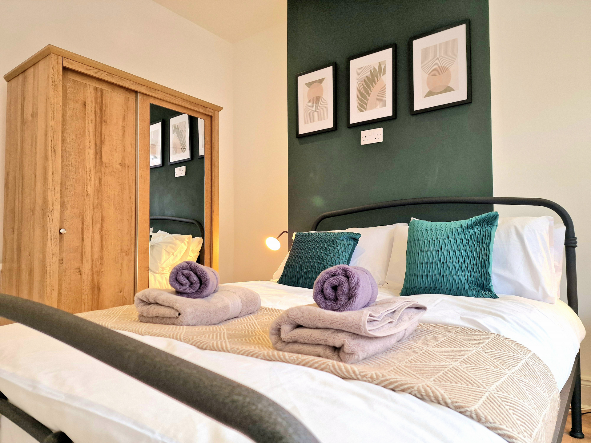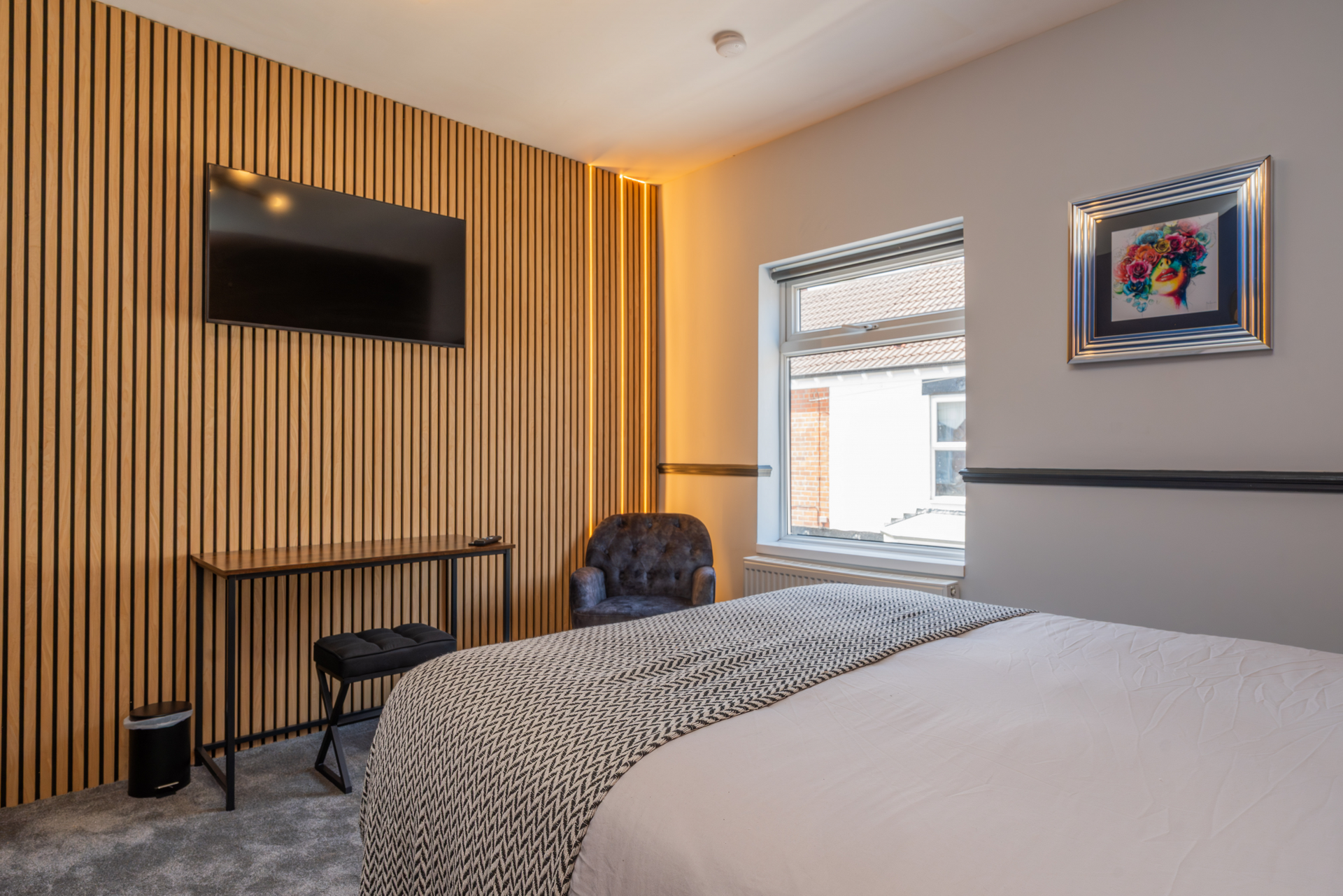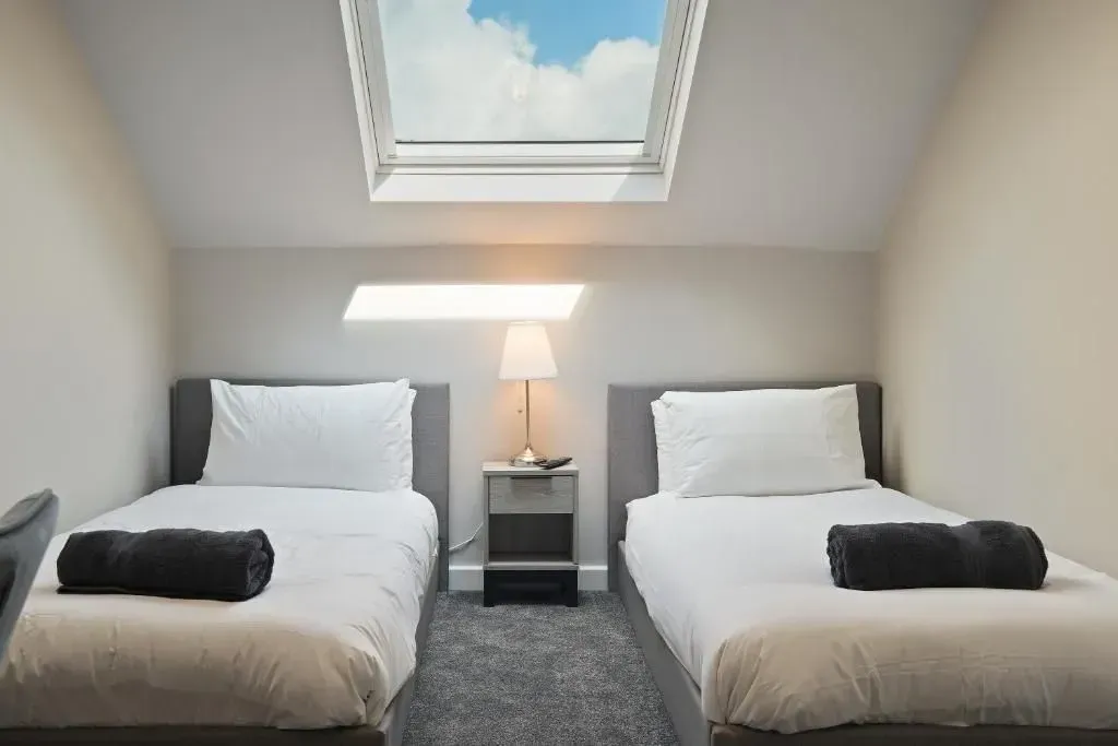 Our 2 Bed Deluxe apartment is on the ground floor at the rear of the building. 2 full bedrooms with desks and access to our gated carpark, secure for your vehicle.