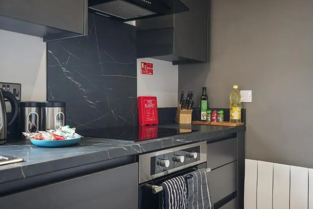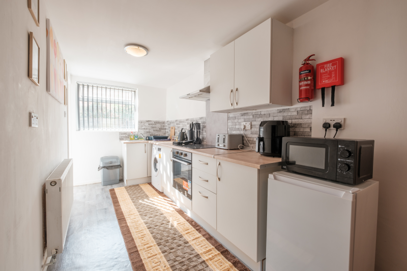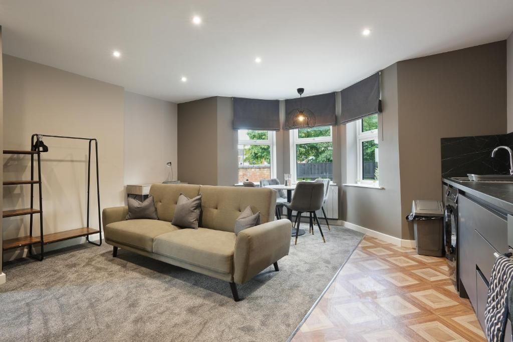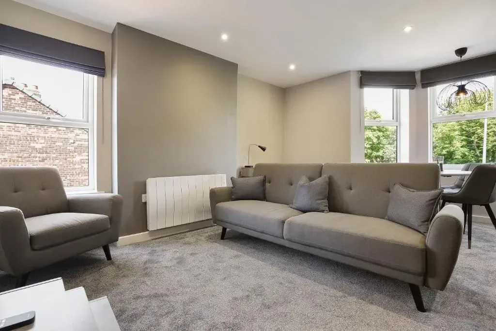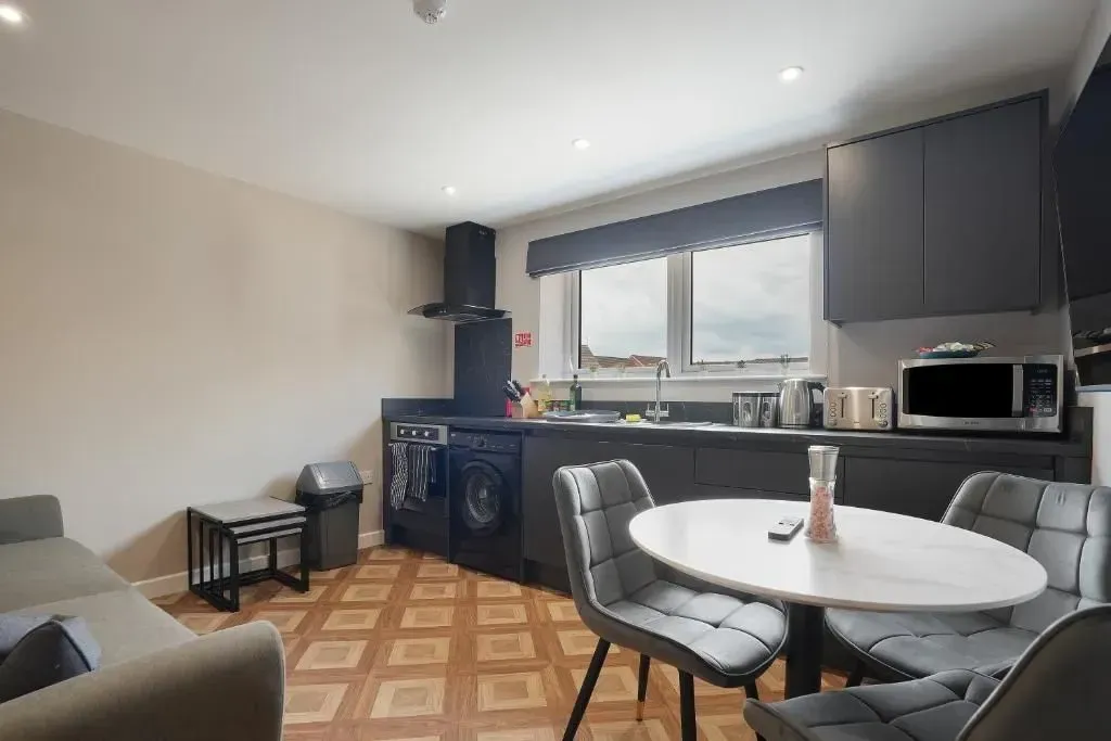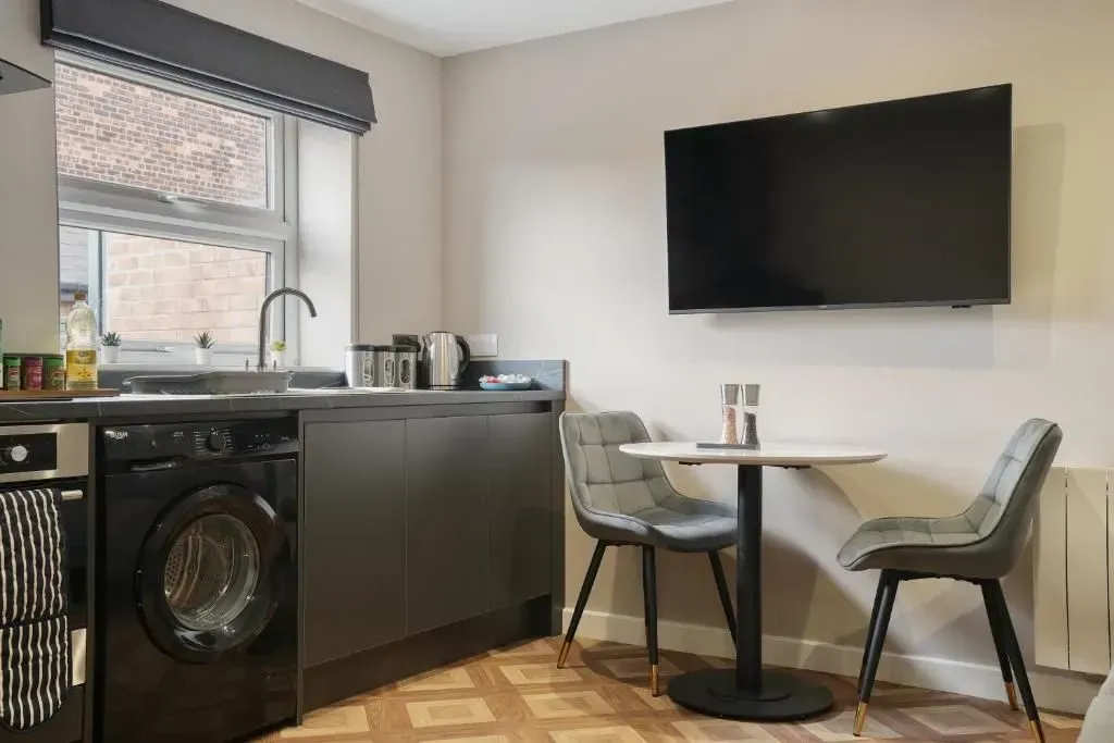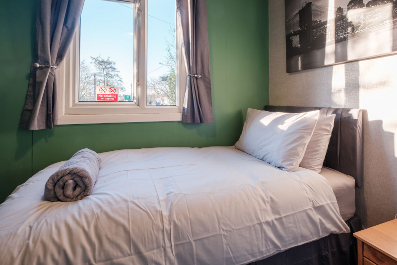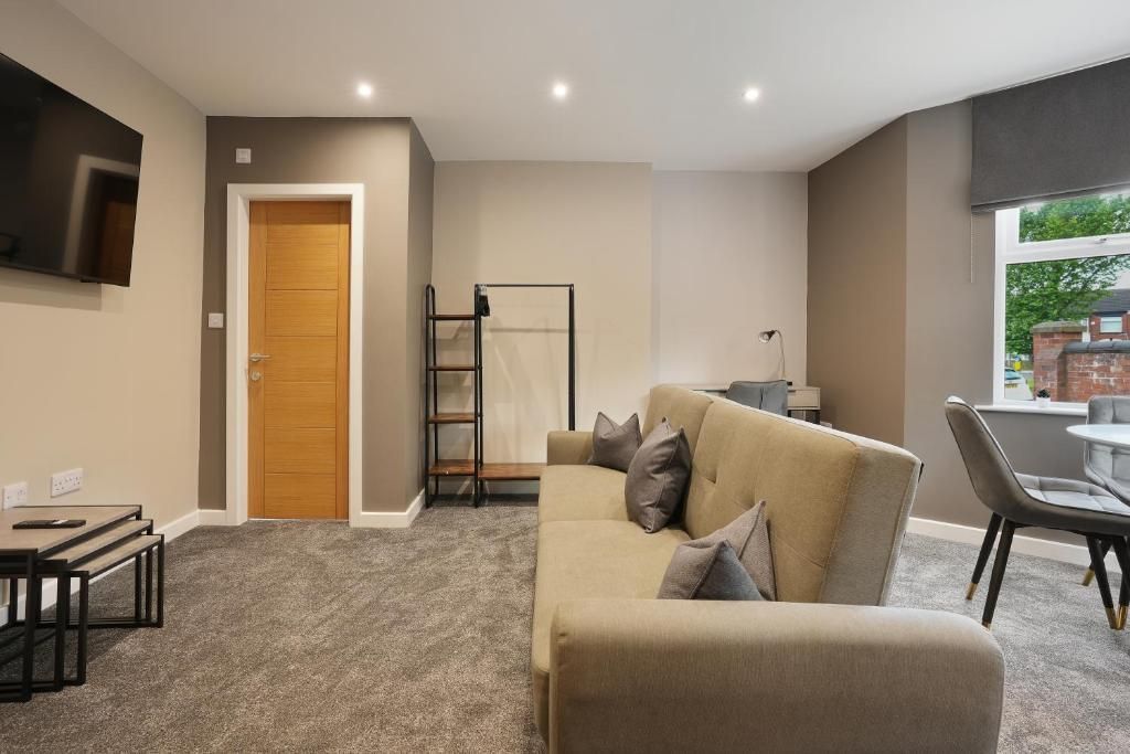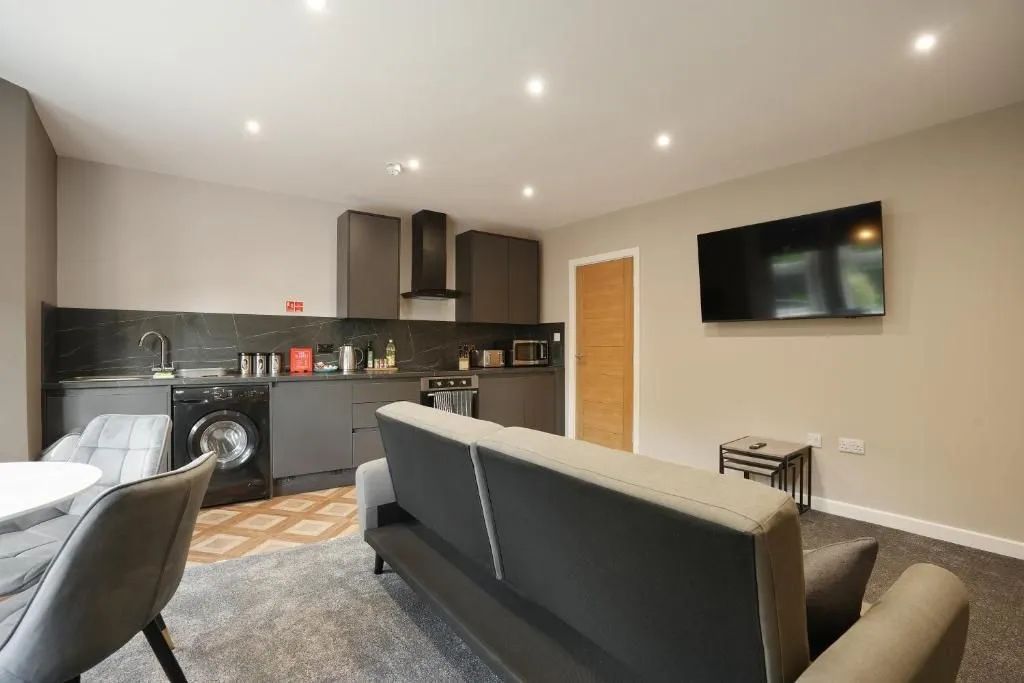 Our Premium Single room apartment is on the 1st floor and one of our most spacious. A large living and dining space, with 2 big sofas, you won't be living on top of anyone else. Secure parking as standard.